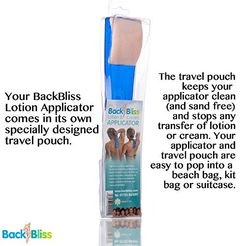 - HANDY WATERPROOF TRAVEL POUCH - Made in England, your BackBliss back medicine applicator comes in a waterproof travel pouch with extra refill pad and easy to follow instructions. Your long reach back lotion applicator and travel pouch are easy to pop into a beach, kit or travel bag and won't transfer any lotion or cream. Ideal to keep in the bathroom or shower, take on holiday and to the gym, the travel pouch will keep your tanning lotion applicator clean and sand free!