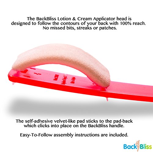 - MOLDS TO THE CONTOURS OF YOUR BACK - BackBliss' lotion applicator patented design molds to the contours of your back for 100% reach. Handle and pad-head slightly curve to exert the right amount of pressure. Self-adhesive velvet-touch pads and long sturdy handle flexes effortlessly to follow your body's contours, easy to hold even with wet or lotioned hands! Slip-resistant grooved handle with firm grip allows you to massage in creams for an even streak-free coverage, no matter how thick.
