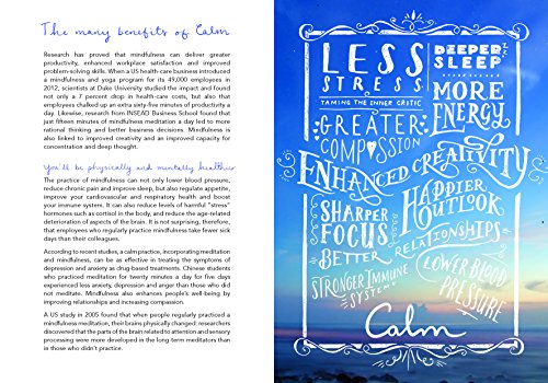 In Calm, Michael Acton Smith combines fascinating neurological research, ancient wisdom, and real-life experiences to demystify meditation and show you the many simple ways to be mindful everyday. Crafted to resemble a journal, filled with beautiful and inspiring artwork, and divided into eight life-balancing sections—Nature, Work, Creativity, Children, Travel, Relationships, Food, and Sleep—Calm can help you change your perspective and rediscover the pleasures of the world. Each section blends fascinating research, creative prompts, activities, instructions, and insights that will stimulate your senses and inspire you.