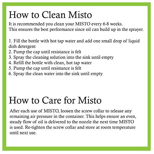 Misto has been used for years by home cooks who like to control the amount of oil they use. The sprayer is designed with the health-conscious cook in mind and is perfect for low fat/high flavor cooking, grilling, sautéing, roasting and basting. Misto is ideal for spraying olive oil on salads, pasta, veggies, breads, pizza, chicken, beef and fish. Buy one for each of your favorite oils; great for vegetable, olive, canola and more. Refill and reuse again and again! Not harmful to environment ; the non-aerosol sprayer doesn't use chemical propellants, and it's refillable, so no more throwing cans away to end up in landfills. MISTO is BPA-free. Please note, threading the cap on incorrectly allows air to escape and in turn does not allow the bottle to build up pressure to spray.For spreading olive oil evenly on bruschetta, focaccia, and grilled or roasted vegetables, and for spraying muffin and cake pans with vegetable oil, this dispenser is a nifty tool. A plastic cap underneath the sprayer's top twists off so the sprayer can be half-filled (1/3 cup) with oil. Inside the top is a plastic tube that fits over the spray nozzle. Push the top up and down to pump air pressure into the canister. Then spray for 10 seconds and pump up again. It's simple, ingenious, and practical. With its cap on, the sprayer stands just 7-5/8 inches high, so it tucks away easily on any countertop. Made of satin-finish aluminum with a black-band accent, it's sleek as well as utilitarian. --Fred Brack