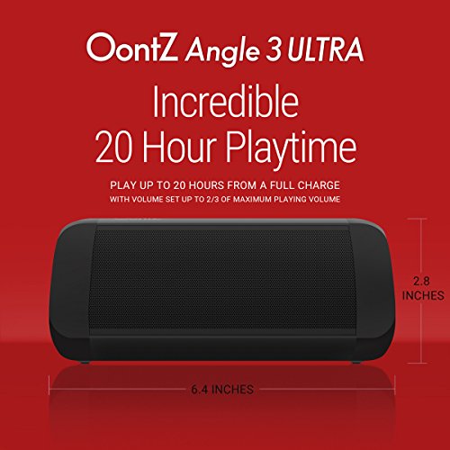 Details: The OontZ Angle 3 ULTRA Portable Wireless Bluetooth Speaker, Designed and Engineered by Cambridge SoundWorks Our Best Sounding Speaker Ever Bluetooth 4.2 – Play up to 100 feet away from your iPhone/Smartphone Crystal Clear Distortion-Free Sound Exceptionally well balanced OontZ Dual Wireless Stereo allows you to connect and play two OontZ Angle 3 ULTRA speakers together up to 100’ apart for incredible stereo separation or playing in two different rooms or playing Inside and Outside Exceptionally Loud Volume from Precision Dual Stereo Drivers 2 X 7 Watts of power Rich Bass Unmatched in a speaker this size Dedicated passive bass radiator with its own grille IPX 6 Rainproof – Splash Proof - Shower Proof The Perfect Shower Speaker Up to 20 Hour Battery Playtime, provides power and performance all day and into the night Stylish Design plays horizontally and stands to play vertically Hands Free Personal Speaker Phone for calls from iPhone and Smartphone Connects quickly over Bluetooth to your iPhone, iPad, Smartphone, Tablet, Laptop with Bluetooth, Chromebook, Echo Dot and Echo AUX IN port for connecting to TVs and Non-Bluetooth Devices Comes with an extra-long 6” Micro USB cable Top Quality Sound Our engineers took on the challenge of designing our latest generation of the OontZ Angle speaker line to have the best available sound