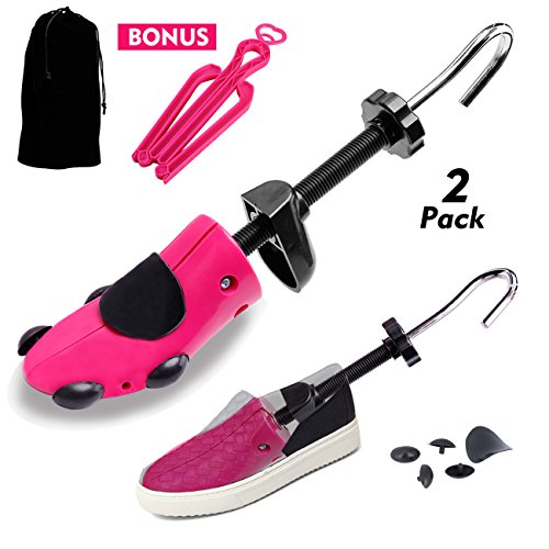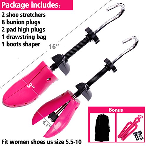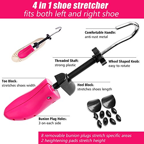 Shoe Stretcher Women Shoe Tree Widener, Pair of 4-way Adjustable Expander Stretch Length Width Height, Tough Plastic & Metal, 8 Bunion Plugs Included, Pink for Women's Shoes Size US 5.5-10