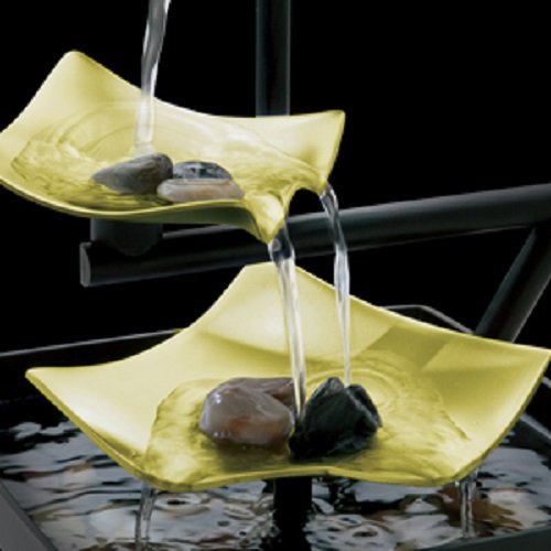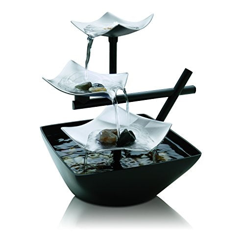 - INNOVATIVE, ARTISTIC DESIGN: This Asian-inspired fountain features 3-tiered leaves that water streams down. Its extra-deep, open-styled basin allows for the serene sounds of cascading waters to fill your home. It was designed with a unique lighting feature that creates a soft reflection of the natural flow of fresh running water. The illuminating glow creates a romantic ambiance. Add the natural river rocks to any of the 3 tiers, or into the basin
