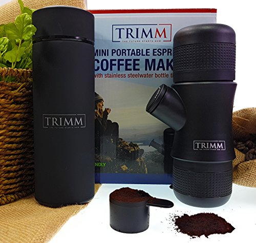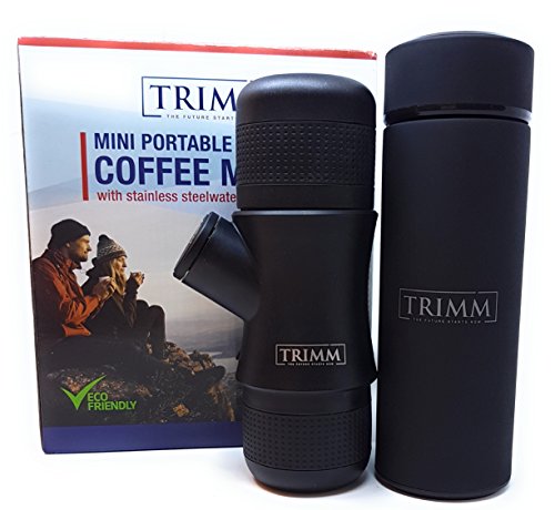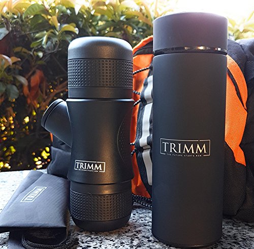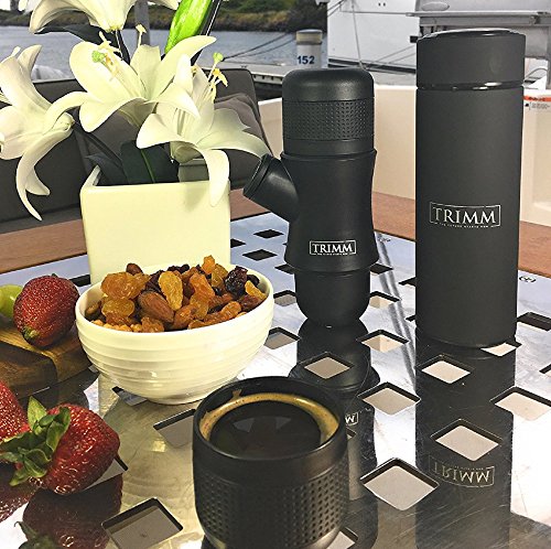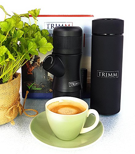 Trimm Portable Espresso Maker - Single Cup Coffee Maker, Manual Espresso Machine with Tea Thermos - Perfect Set. Never go a morning without coffee, espresso, or lattes again. Whether you are at home, at the office, on vacation, experiencing a power shortage, or out in the wilderness, you can easily make freshly brewed coffee in minutes. Not requiring any batteries or electricity, all you need is hot water and the Trimm hand-press espresso maker kit. You can pump your way to fresh, delicious coffee in seconds.
