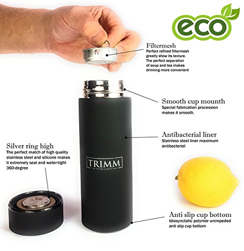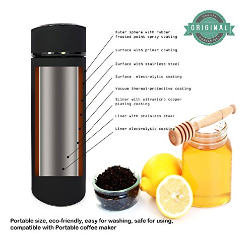 - MAKES TEA AND INFUSED WATER, TOO!: The stainless steel, thermos bottle for hot drinks not only keeps your coffee and other drinks warm for long periods of time, you can also steep tea with this travel coffee tumbler. The thermos comes with a removable strainer, so just add your loose leaf tea to it the top. Is it a hot day and you're not in the mood for something warm? No problem. You can place fruit in the infuser instead to add a touch of sweetness to water or ice tea.